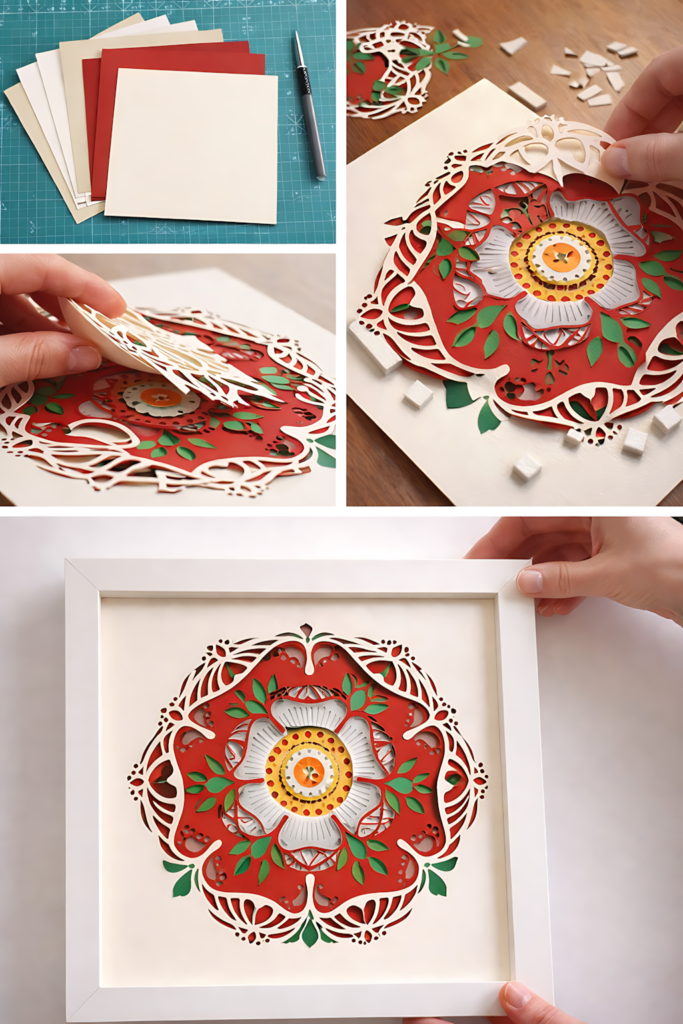 The basics are cardstock, scissors or a cutting machine, glue or foam tape, and a shadow box frame that fits your design’s dimensions. Many templates can also be adapted for a light box setup — just add LED strip lighting between the layers and let the design do the rest.